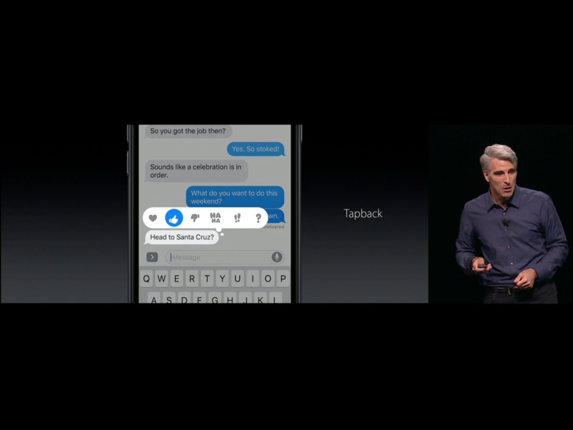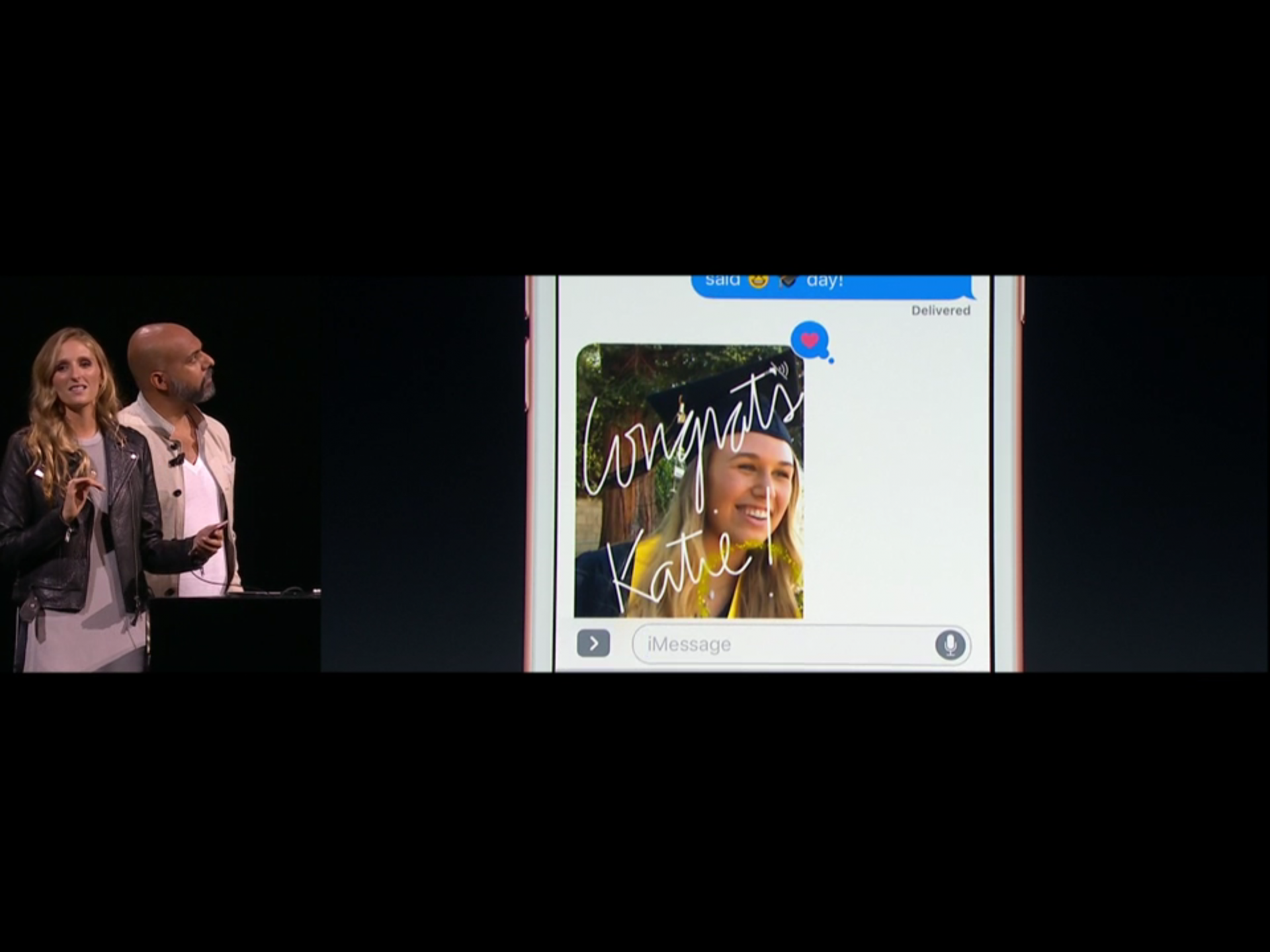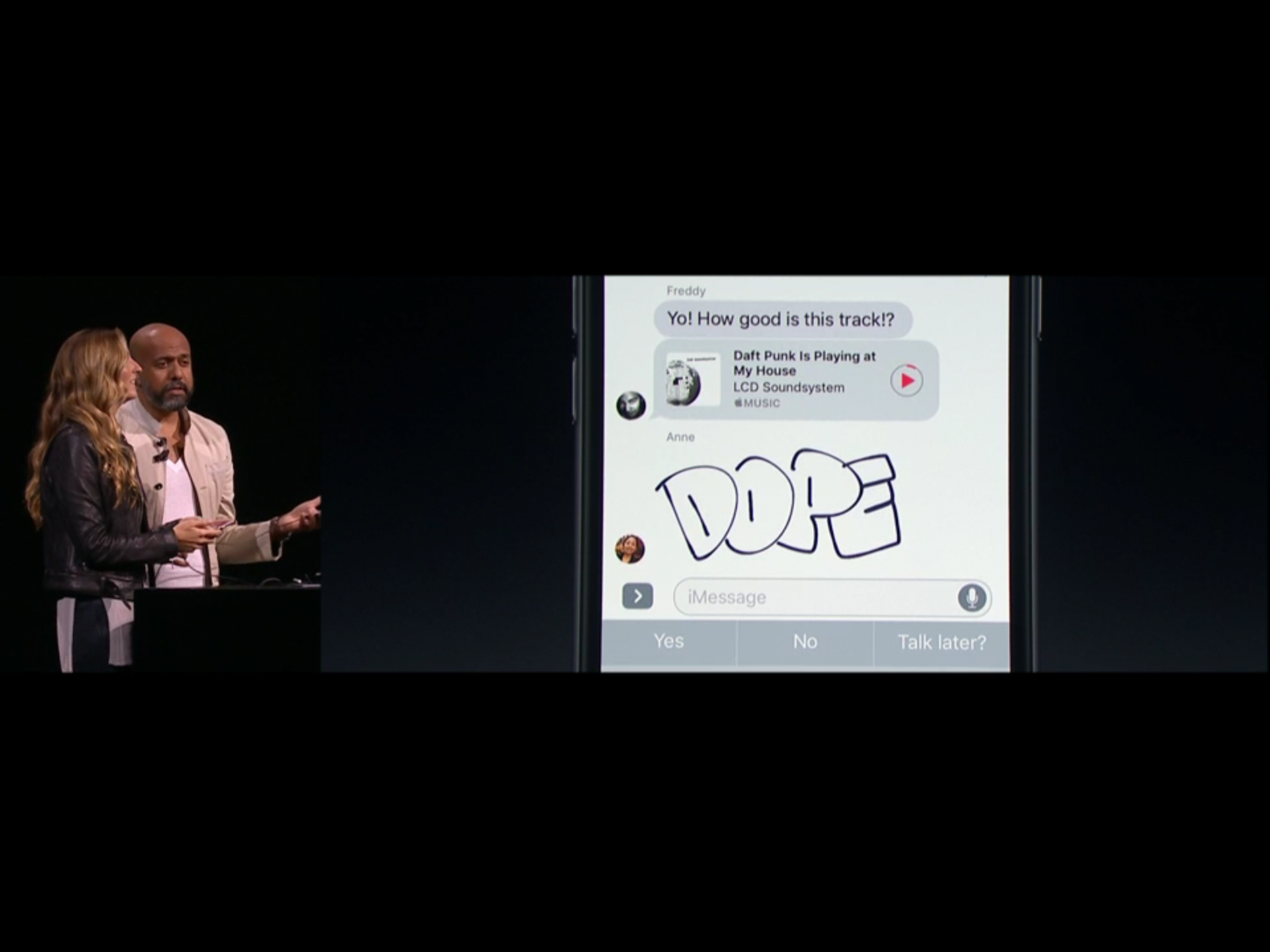 สำหรับ iMessage นี้มีการเปลี่ยนแปลงขึ้นหลายอย่าง ที่เห็นชัดก็คือ ตัว กล่องข้อความ Emoji ตัวใหญ่ขึ้นกว่าเดิม 3 เท่า สามารถใช้งาน Sticker ได้แล้ว มีลูกเล่นพิเศษอย่าง Bubble effects ที่สามารถเลือกระดับของเอฟเฟกต์ของตัว Bubble ของข้อความได้ สามารถทำให้ข้อความหรือรูปมัว แล้วทำให้มองเห็นได้ด้วยการลากที่จอ สามารถเขียนเป็นลายมือของเราส่งไปได้ สามารถถ่ายรูปแล้วเขียนลงบนรูปแล้วส่งไปได้ รวมถึงเอฟเฟกต์ที่ทำให้หน้าจอของเราเปลี่ยนสีได้ รวมถึงมีแอปที่รองรับการใช้งานร่วมกับ iMessage ใน App Store ด้วย