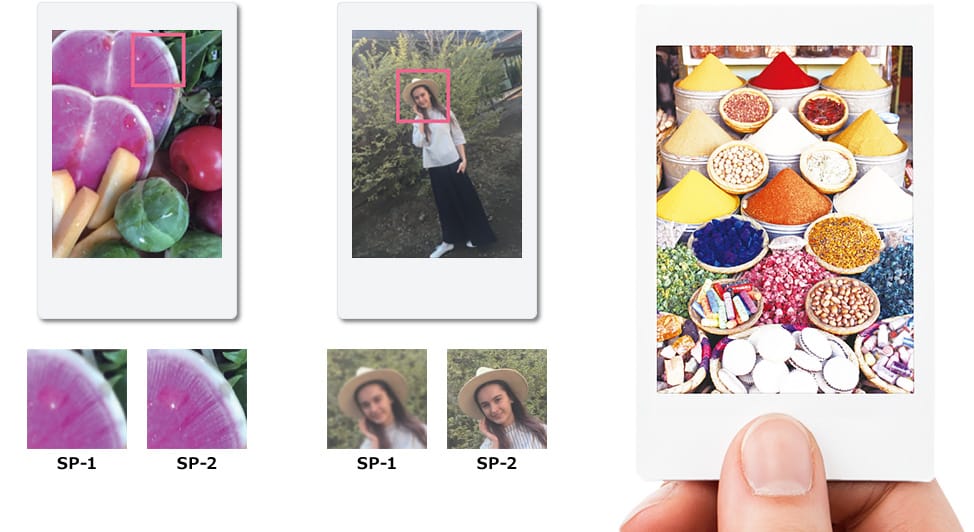 ความแตกต่างในเชิงเทคนิคของ SP-1 กับ SP-2 อย่างแรกคือความละเอียดที่เพิ่มขึ้น จาก SP-1 พิมพ์ด้วยความละเอียด 254 dpi แต่ใน SP-2 ได้ขยับเพิ่มขึ้นเป็น 320 dpi แล้ว ก็ถือว่าแก้ไขข้อจำกัดของรุ่นแรกที่ทีมงานแบไต๋เคยวิจารณ์เอาไว้ว่าพิมพ์ออกมาแล้วภาพแตกๆ ไม่สวยเท่าถ่ายจากกล้อง Instax จริงๆ