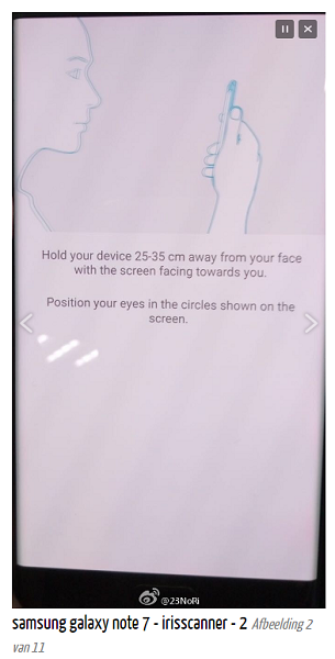 หลังจากที่มีภาพด้านหน้าของ Samsung Galaxy Note 7 ของ AT&T หลุดออกมา ล่าสุดก็ได้มีภาพหลุดของสมาร์ทโฟนรุ่นดังกล่าวจากเว็บ Weibo ของประเทศจีน ซึ่งแสดงให้เห็นว่า Galaxy Note 7 จะมีฟีเจอร์สแกนม่านตาจริงๆ โดยผู้ใช้จะต้องวางตำแหน่งหน้าจอของสมาร์ทโฟนให้ห่างจากใบหน้าประมาณ 25-30 ซม. และจ้องไปที่วงกลม 2 วงที่ปรากฏบนหน้าจอเพื่อปลดล็อคเครื่อง