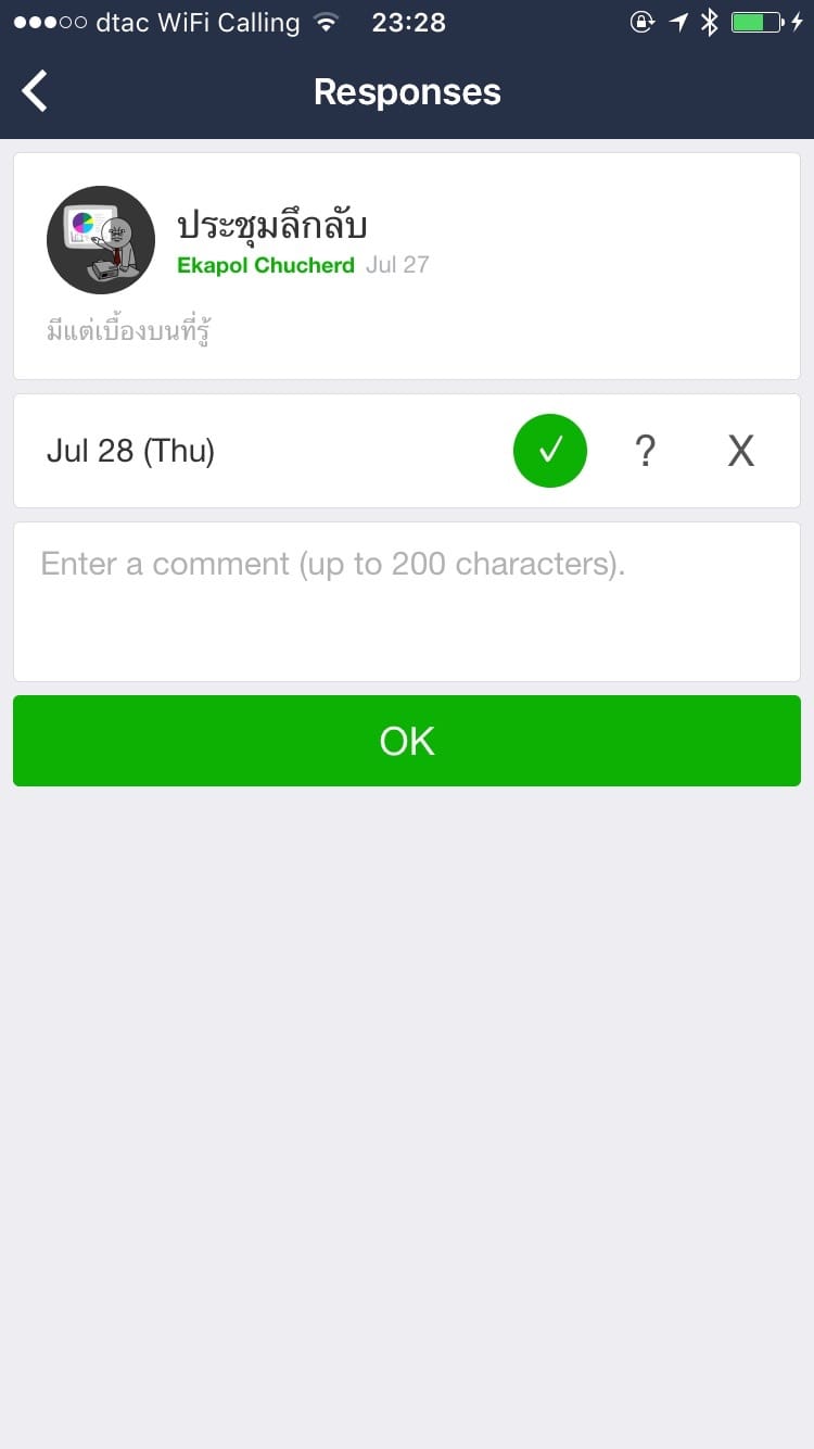 แล้วฟังก์ชั่นที่ไม่ได้อยู่ในบันทึกการเปลี่ยนแปลงแต่เพิ่งเห็นในไลน์เวอร์ชั่นนี้คือ LINE Schedule ที่สามารถเรียกได้จากปุ่ม + แล้วกดที่ Schedule เพื่อแจ้งตารางนัดหมายกับเพื่อนในไลน์ หรือเพื่อนในกลุ่มแซต ซึ่งผู้รับก็สามารถเข้าไปคอมเมนต์ในนัดหมายนั้น พร้อมทั้งระบุว่าจะไปหรือไม่ไปร่วมก็ได้