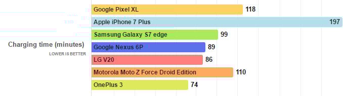 ส่วนลองมองย้อนกลับในการชาร์จไฟกลับจาก 0% ถึง 100% Google Pixel XL นั้นมีการรองรับเทคโนลีชาร์จไวทำให้ใช้เวลาเพียง 2 ชั่วโมงเท่านั้น แต่ก็ยังมากกว่าเทคโนโลยีการชาร์จไวของ Samsung อยู่ประมาณ 20 นาที แต่สำหรับ iPhone 7 Plus กลับใช้เวลาถึง 3 ชั่วโมง 20 นาที ถึงจะเต็ม