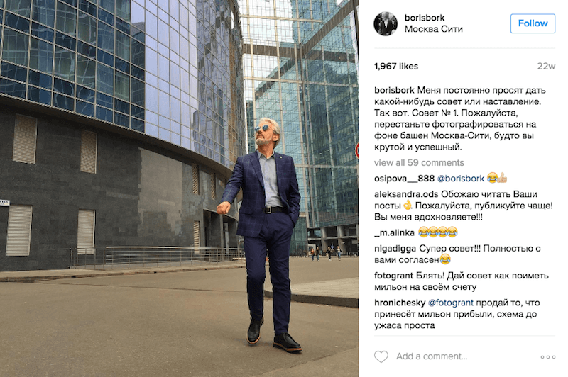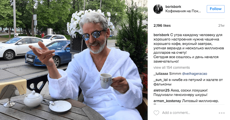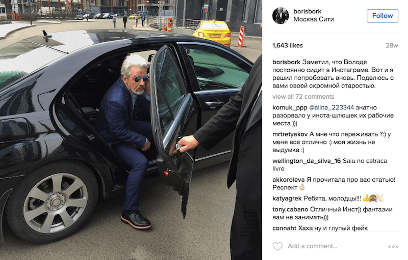 “โรมัน ซาริพอฟ” นำ “บอริส คูเดรียชอฟ” ชายวัยเกษียนที่ในชีวิตจริงมีรายได้เพียงเดือนละประมาณ 7,000 บาทเท่านั้น มาสวมบทดังกล่าว โดยนำมาแปรงโฉมแต่งองค์ทรงเครื่องเป็นมหาเศรษฐี และตั้งบัญชีอินสตาแกรมของชายวัยเกษียนโดยใช้ชื่อว่า “บอริส บอร์ก”