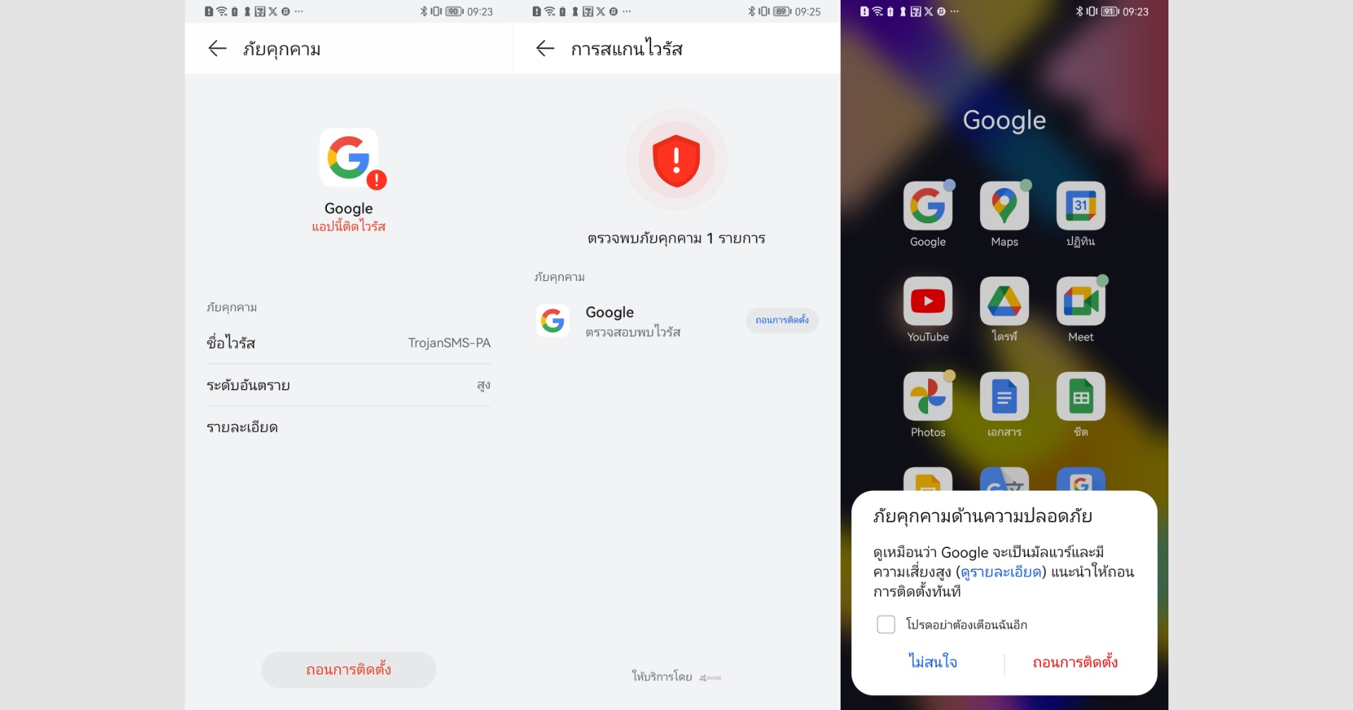 สมาร์ตโฟน Huawei ของทีมงานได้รับข้อความ ความผิดปกติบางอย่างของแอป Google ซึ่งในข้อความระบุว่ามีโทรจันแฝงเข้ามาด้วย จากการลบและถอนการติดตั้งก็ยังปรากฏข้อความนี้อยู่ ตามตัวอย่างด้านล่าง – Google กลายเป็นภัยคุกคามไปเสียแล้ว