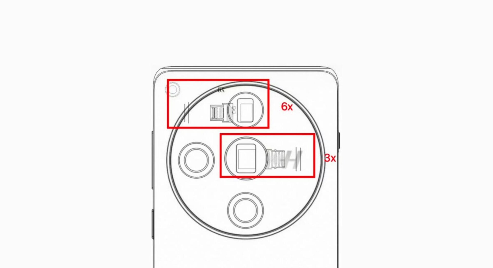 แผนผังแสดงกล้องทั้งหมด 4 ตัว โดย 2 ตัวในนั้นเป็นเลนส์กล้องปริทรรศน์ โดยตามรายงานระบุว่า กล้องจะมีความละเอียด 50 MP และให้การซูม 6 เท่าโดยใช้เซนเซอร์ Sony IMX 858 1/2.51′ ในขณะที่กล้องซูม 3 เท่าใช้เซนเซอร์ IMX 890 1/1.56′