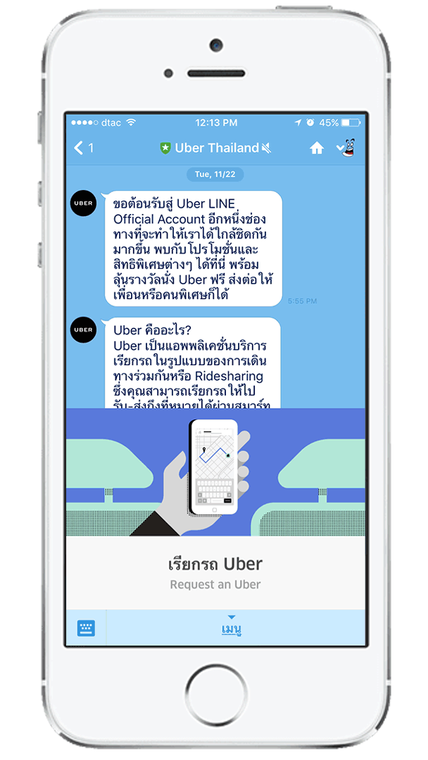 ยิ่งไปกว่านี้ ยังมีการอำนวยความสะดวกให้ผู้ใช้บริการของ Uber อีกด้วย โดยสามารถเรียกรถได้ผ่านทาง LINE โดยตรงได้เลย ไม่จำเป็นต้องดาวน์โหลดแอป Uber มาไว้ในเครื่อง