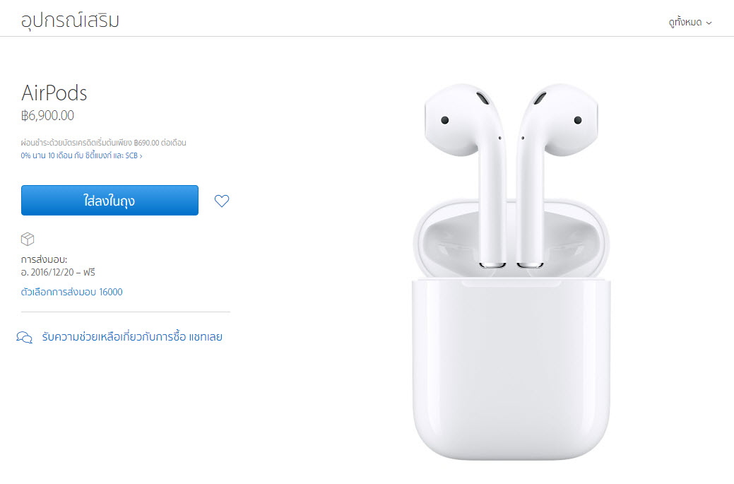 หลังจากที่ดีเลย์มาสักระยะนึงแล้ว วันนี้ Apple ได้เริ่มวางขาย AirPods หูฟังไร้สายอันจิ๋ว ที่เพิ่งเปิดตัวมาพร้อมกับ iPhone 7 อย่างเป็นทางการแล้วผ่านทาง Apple Online Store