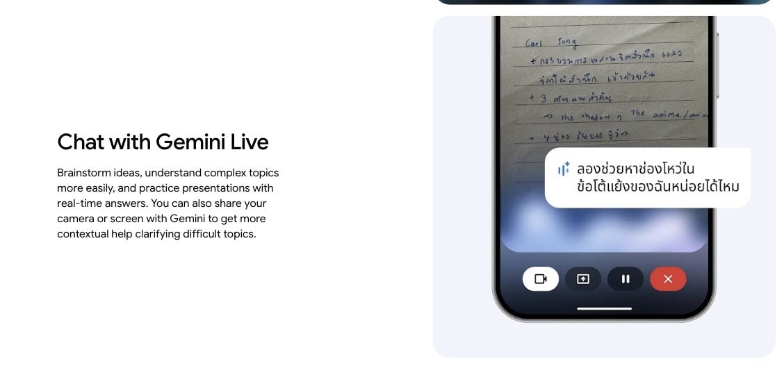 - Gemini Live: สามารถพูดคุย สื่อสารแทนการพิมพ์กับฟีเจอร์นี้ได้เลย หรืออาจจะอัปโหลดรูปลงไปแล้วถาม Gemini ให้ช่วยวิเคราะห์ก็ได้