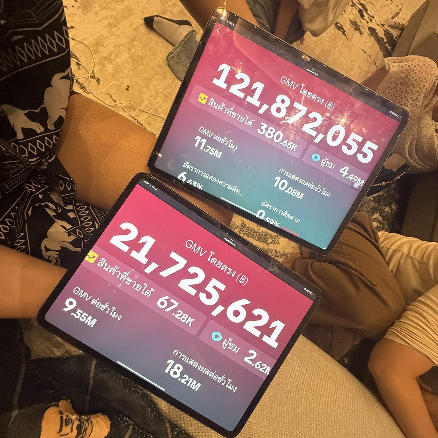 จากรูปของเจนนี่ ทำยอดขายรวม (GMV) ไปได้ 121,872,055 บาท จากการขายสินค้า 380,650 ชิ้น และมีผู้ชม 4.49 ล้านคน ส่วนด้านล่างทำยอดขายรวม (GMV) ไปได้ 21,725,621 บาท จากการขายสินค้า 67,280 ชิ้น และมีผู้ชม 2.62 ล้านคน เป็นต้นครับ