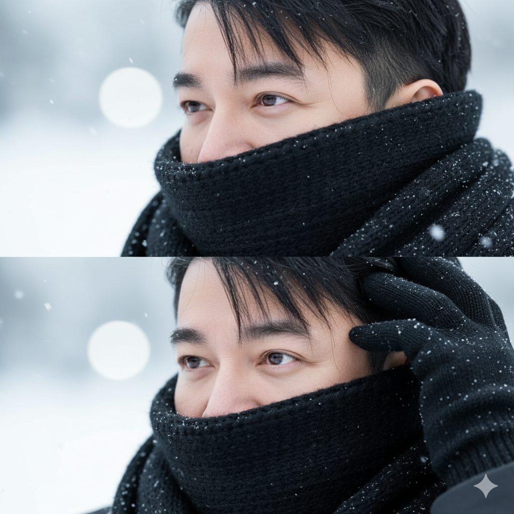 2-Frame Composition Top Frame: Extreme close-up, 3/4 view. Only one eye is clearly visible. Crop out the forehead and chin. The scarf covers the mouth area. Bottom Frame: Extreme close-up, 3/4 view (other side). A black knit glove is visible touching the temple. The scarf is pulled high to the bridge of the nose. Quality: Very high resolution. Preserve pore-level skin detail and snow crystals. Natural editorial retouching.