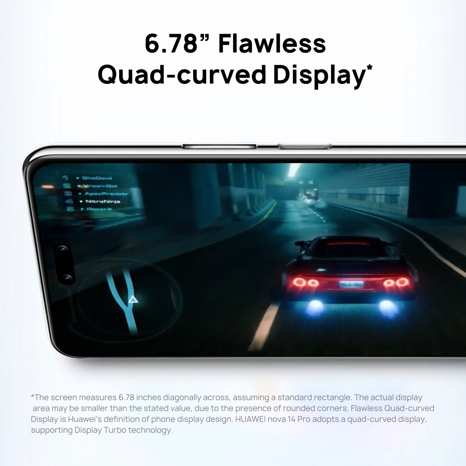 - HUAWEI nova 14 Pro: หน้าจอขนาดใหญ่ 6.78 นิ้ว ขอบโค้งพรีเมียม ให้สัมผัสที่จับถนัดมือ