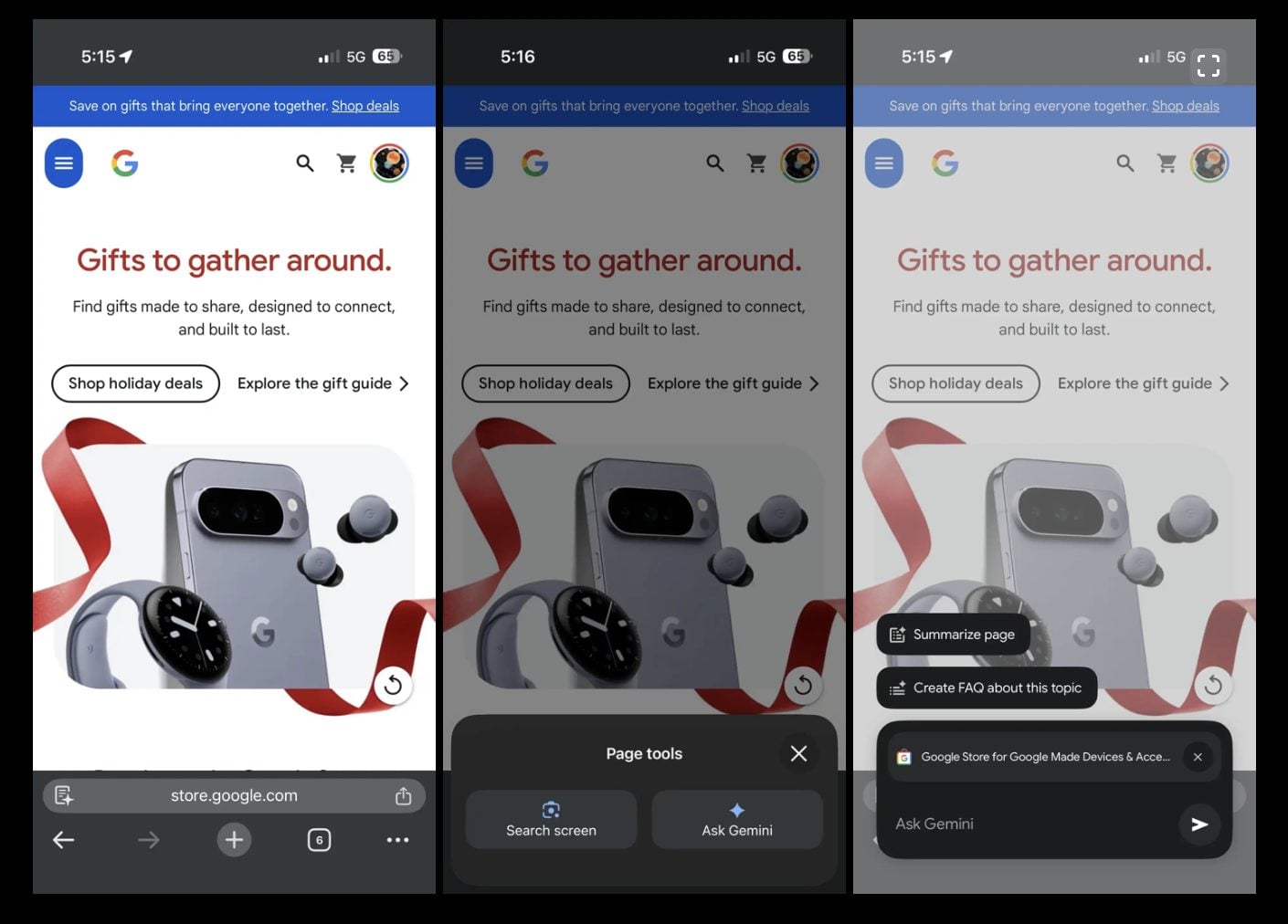 โดยสังเกตได้จากบริเวณแถบที่อยู่ของเว็บไซต์ Address bar ด้านซ้ายมือ จากเดิมที่เป็นรูปกล้อง หรือ Google Lens ตอนนี้ได้เปลี่ยนมาเป็นไอคอนหน้ากระดาษที่มีรูปดาวของ Gemini แทน ซึ่งเมื่อเราแตะที่ไอคอนนี้ก็จะมีเมนู Page tools เลื่อนขึ้นมาพร้อม 2 ตัวเลือก นั่นคือ Search screen (ค้นหาบนหน้าจอแบบเดิม) และ “Ask Gemini”