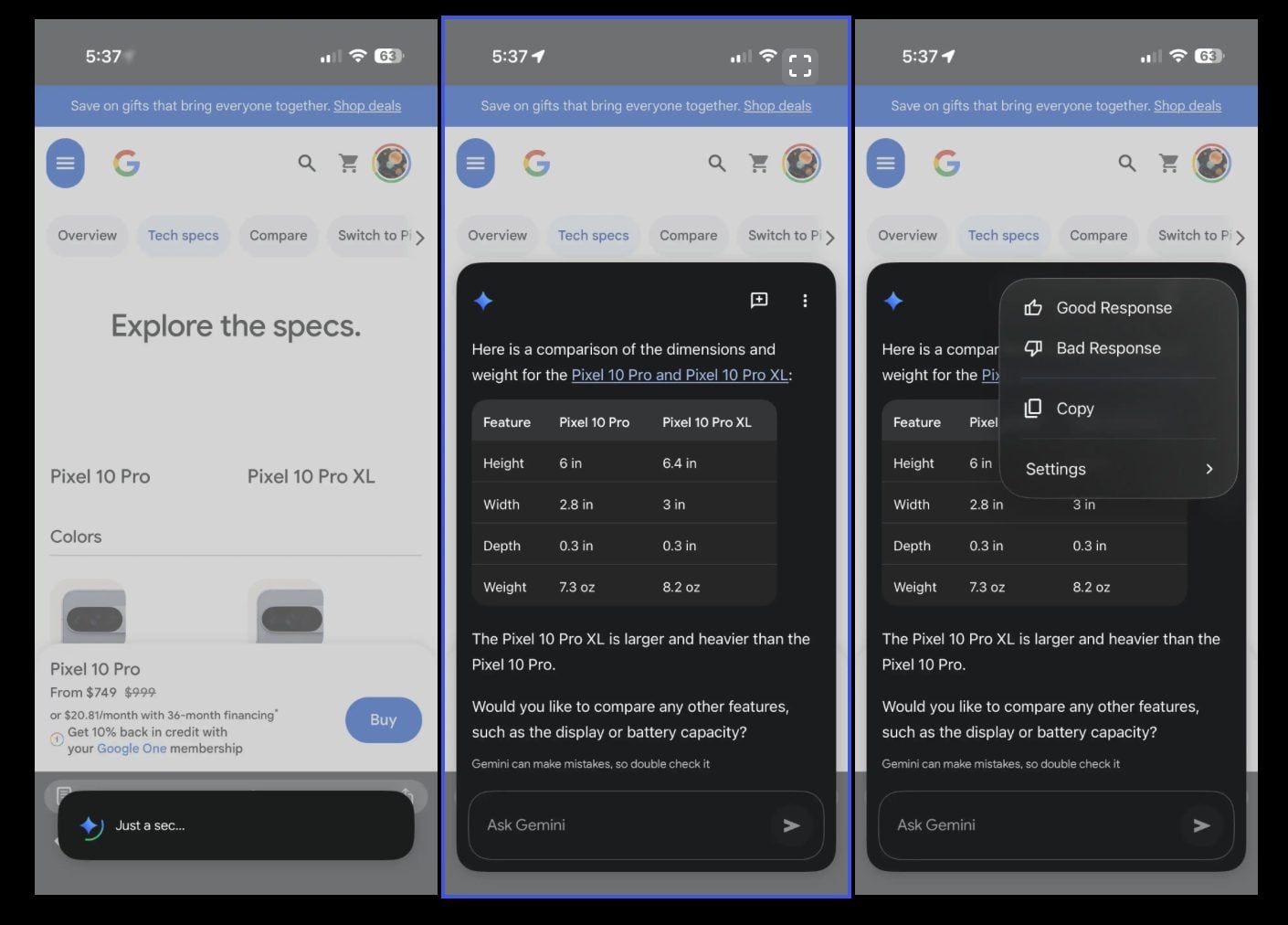 เมื่อกดใช้งาน Ask Gemini ตัวแอปฯ จะแสดงหน้าต่างซ้อนขึ้นมาเหนือหน้าเว็บ ดีไซน์คล้ายกับบน Android พร้อมแชร์ URL หน้าที่เราเปิดอยู่ให้ AI ทันที โดยเราสามารถสั่งงานได้หลากหลาย เช่น