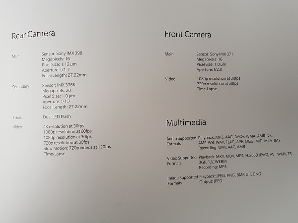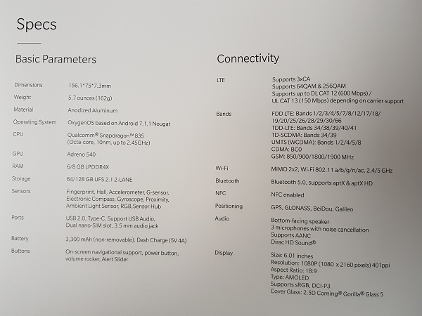 จากภาพที่ปรากฏข้างต้น จะเห็นได้ว่า OnePlus 5T นั้น มีดีไซน์คล้ายกับ Oppo R11s ที่เพิ่งเปิดตัวไปก่อนหน้านี้ ซึ่งตรงกับข่าวลือแทบจะทุกประการ และมีสเปคที่น่าสนใจ ดังนี้