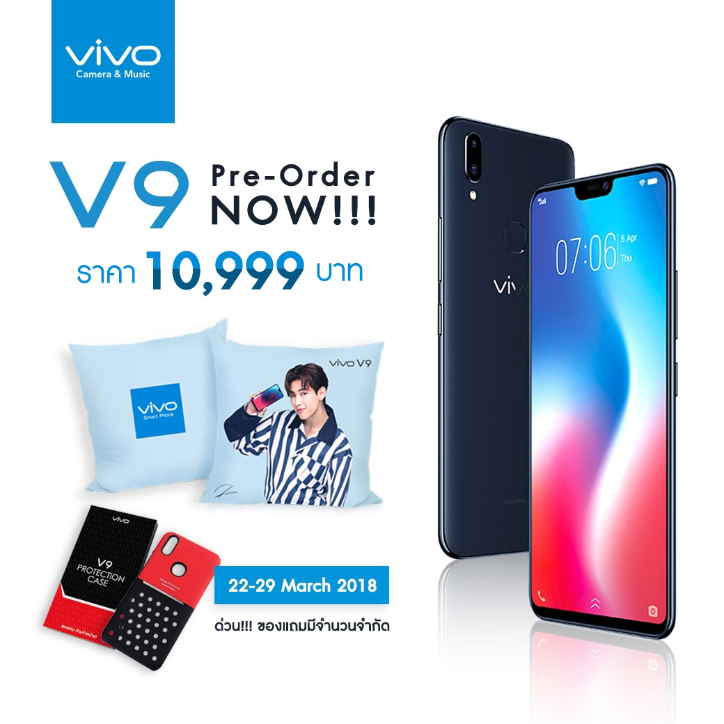 ส่วนราคาขายในไทยของ Vivo V9 นั้นอยู่ที่ 10,999 บาท ซึ่งถ้า Pre-Order ตอนนี้จะได้รับหมอนรูปพรีเซนเตอร์แบมแบม (แม่ะ) และเคสสวยๆ ไปด้วยเลย