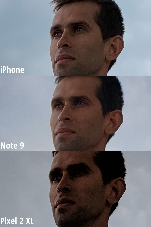 iPhone XS Max ได้แสดงให้เห็นภาพที่น่าประทับใจ มีการควบคุมสีได้ดี ท้องฟ้าดูแล้วสวยงามมาก แต่ใบหน้านั้นมีการเร่งสีจนเกินจริงไป ในขณะที่ Galaxy Note 9 นั้นในสีที่เป็นธรรมชาติ ดูดีมากเช่นกัน แต่โทนสีอบอุ่นบนท้องฟ้ายังไม่ชัดเจนเท่า iPhone XS Max