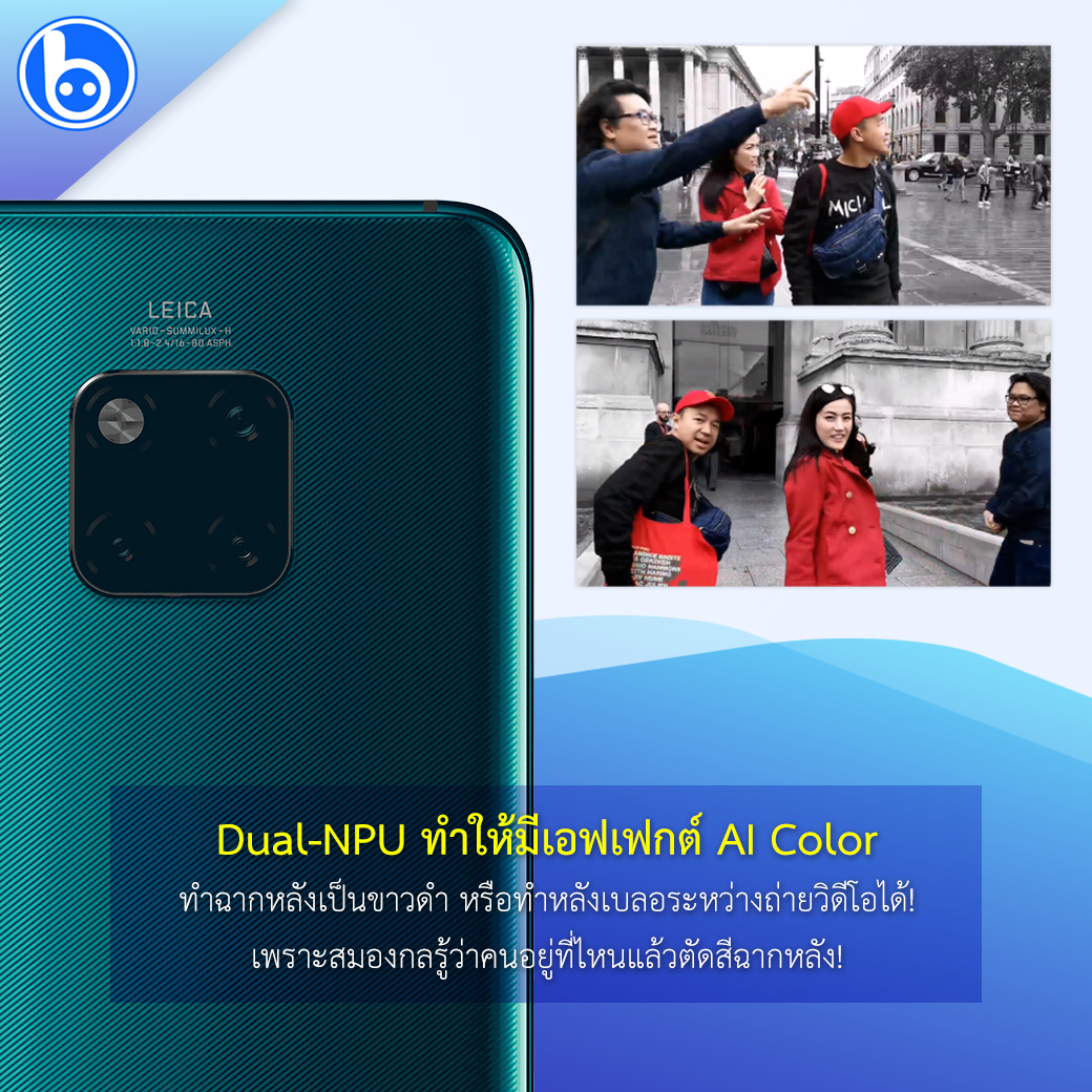 เมื่อ Huawei Mate 20 Series ทุกตัวใช้ชิป Kirin 980 ทำให้มี dual-NPU หรือหน่วยประมวลผลปัญญาประดิษฐ์คู่ จึงทำเอฟเฟกต์ AI Color ทำฉากหลังเป็นขาวดำ หรือทำหลังเบลอระหว่างถ่ายวิดีโอได้! เพราะสมองกลรู้ว่าคนอยู่ที่