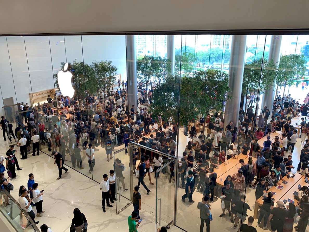 เมื่อประตูเริ่มเปิด แถวอันยาวเหยียดก็เริ่มเคลื่อนตัวอย่างรวดเร็ว ไม่ปล่อยให้ผู้คนต้องยืนรอนาน โดยเหล่าพนักงานได้ยืนเรียงแถวรอที่หน้าประตูทางเข้า ส่งเสียงเชียร์ ปรบมือ และแปะมือไฮไฟว์ (High Five) ต้อนรับทุกคนที่ได้เข้ามายัง Apple Iconsiam แห่งนี้ ซึ่งสร้างความพลังด้านบวกให้กับผู้มาเยือนได้เป็นอย่างดี