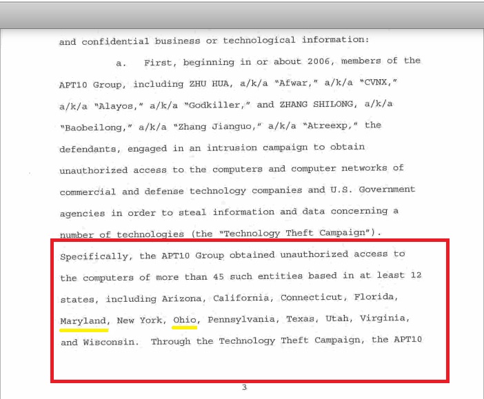 คำฟ้องบางส่วนถูกเผยแพร่จาก DOJ ระบุว่า ระบบคอมพิวเตอร์ทั้ง 45 องค์กร 12 มลรัฐ ที่ถูกแฮคเกอร์ทั้งสองเข้าโจมตี มีอยู่ 2 มลรัฐที่เป็นเป้าหมายสำคัญ ซี่งหน่วยความมั่นคงกังวงถึงจุดนี้เป็นพิเศษ คือ
