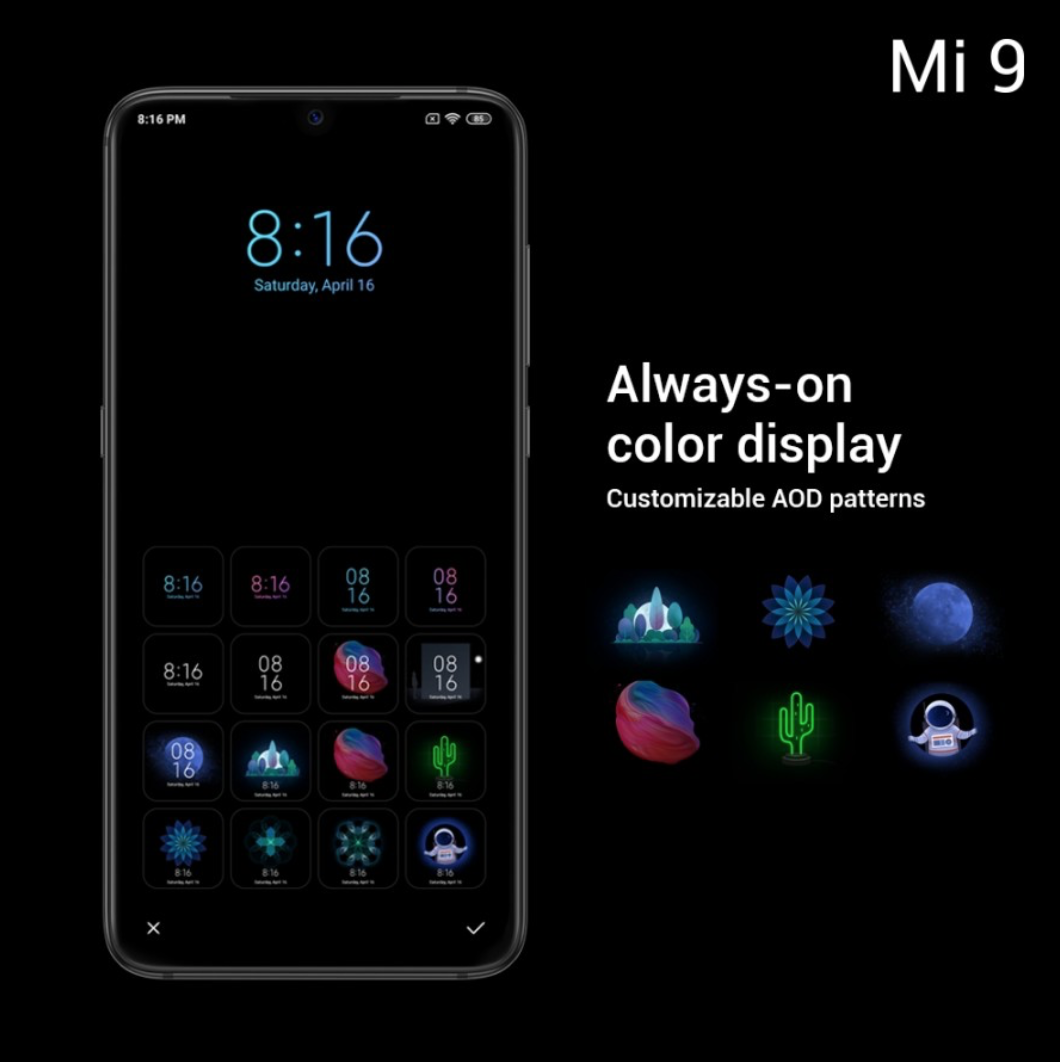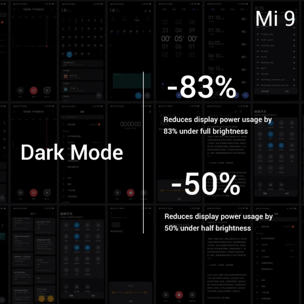 ด้านหน้าตาหรือ UI ของ Mi 9 จะมีการพัฒนาให้ดูดีขึ้น ใช้งานได้ง่ายขึ้น มี Live Wallpaper ที่จะเปลี่ยนการแสดงผลเฉดสีไปแบบอัตโนมัติ พร้อมหน้าจอ Always On-Display แบบมีสีสัน และ Dark Mode ที่ช่วยประหบัดแบตเตอรี่ในสภาพแสงสูงสุดได้ถึง 83% เลยทีเดียว