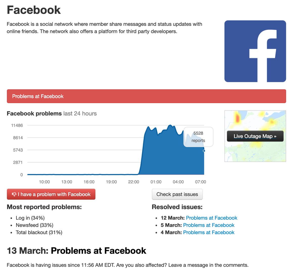 ปกติเราจะดึงข้อมูลจากหน้า Status Dashboard ของ facebook เพื่อดูรายงานปัญหาของระบบและการแก้ไขของเฟซบุ๊ก แต่การล้มครั้งนี้หนักจนหน้านี้ก็โหลดไม่ขึ้น เราจึงขออ้างอิงข้อมูลจาก downdetector.com มาแทน ซึ่งมีการรายงานว่าเฟซบุ๊กมีปัญหาตั้งแต่ช่วงเที่ยงคืนเข้าสู่วันที่ 14 มีนาคมตามเวลาประเทศไทย ซึ่งตอนที่เขียนข่าวนี้คือ 8.00 น. เฟซบุ๊กก็ยังล่มอยู่เลย หน้าเว็บบางส่วนยังเข้าไม่ได้ ซึ่งบางคนก็ใช้ WhatsApp, Messenger ไม่ได้ด้วย