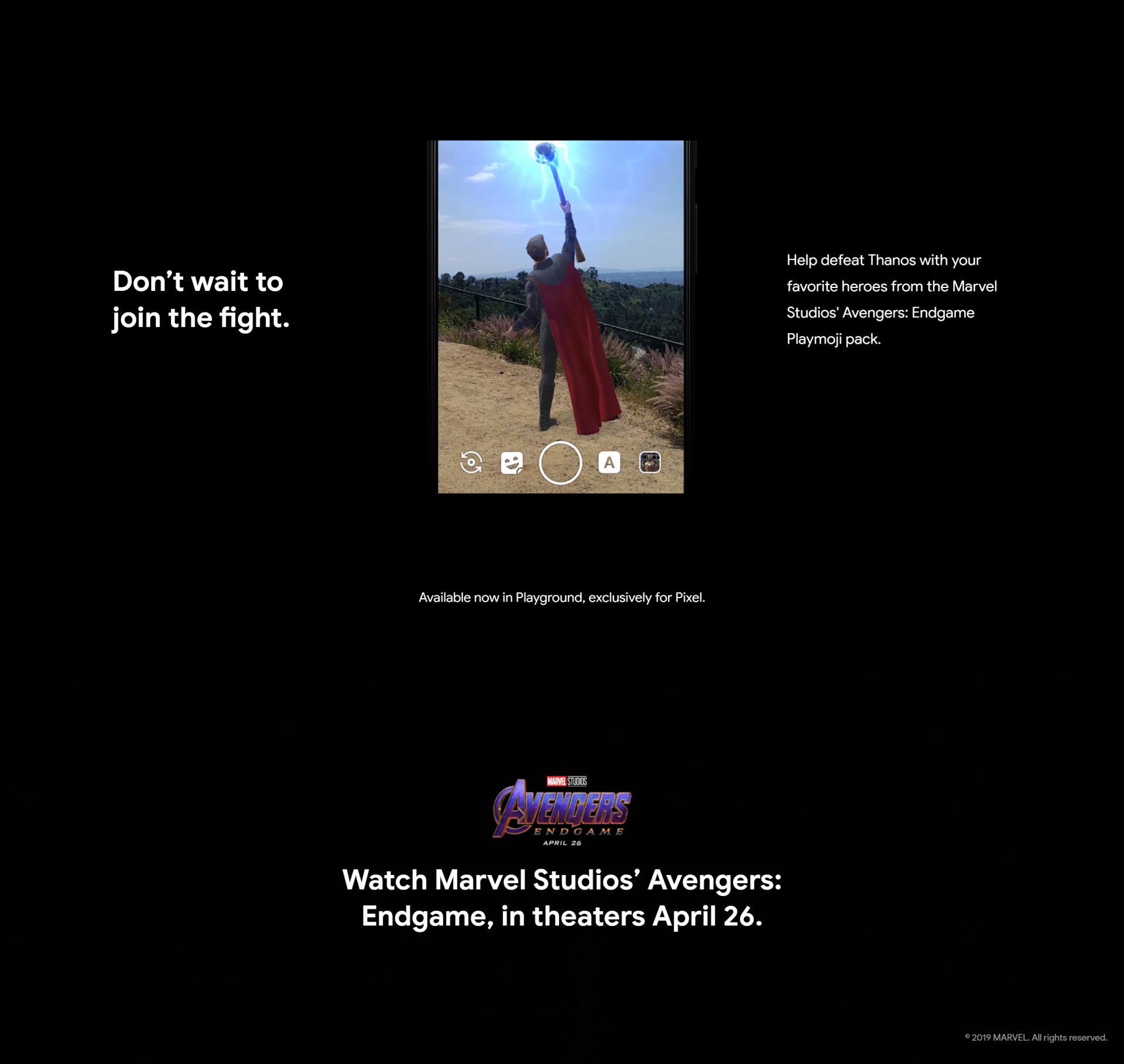 ในหน้าเว็บ Google Store ขึ้นสโลแกน “Help is on the way.” และฟีเจอร์ใหม่สำหรับผู้ใช้งาน Pixel โดยเฉพาะ ที่จะสามารถถ่ายรูป/วีดีโอกับตัวละคร Marvel ได้ ผ่าน Playmoji