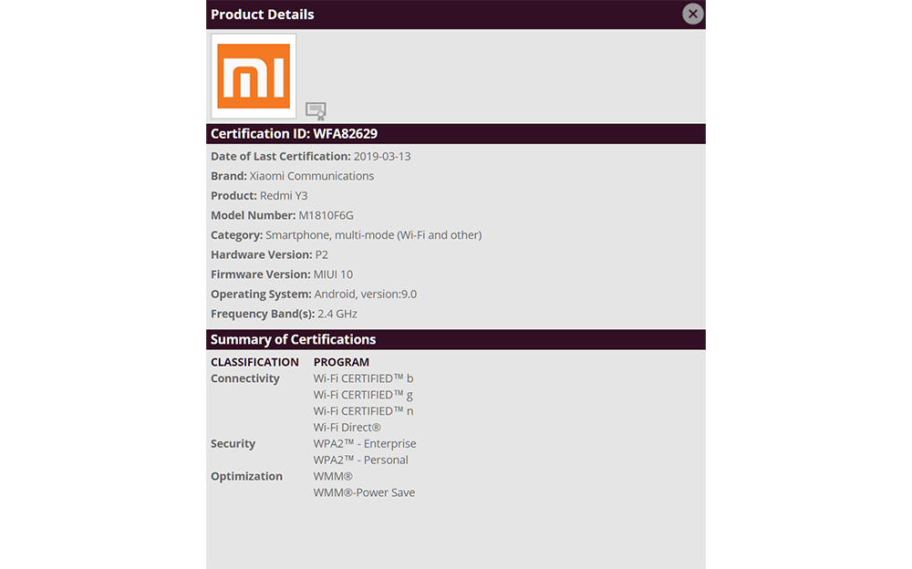 ก่อนหน้านี้เมื่อเดือนที่แล้วก็สมาร์ทโฟนชื่อรุ่น Redmi Y3 ได้รับการรับรองจาก Wi-Fi Alliance และก็ได้พูดถึงสเปคบางอย่างด้วยว่า Redmi Y3 นี้จะรันบน Android 9 Pie ที่ครอบด้วย MIUI 10 อีกที แต่สามารถรับ Wi-Fi ได้แค่ 2.4 GHz เท่านั้น