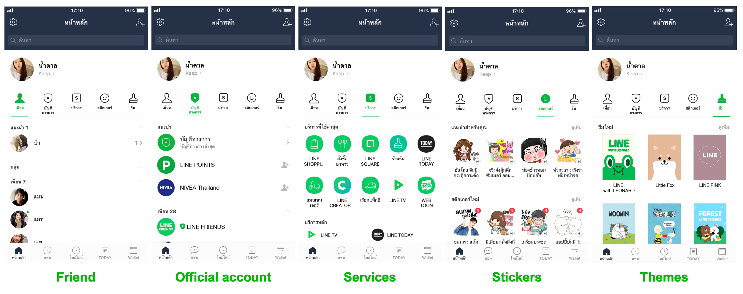 LINE ออกแบบแท็บ Home ขึ้นมาใหม่เพื่อให้ผู้ใช้จัดการรายชื่อเพื่อน, รายชื่อ Official Account, บริการต่างๆ จาก LINE และการซื้อสติกเกอร์และธีมต่างๆ ได้ง่ายขึ้นครับ จากเดิมที่บริการเหล่านี้จะกระจายออกไปในหลายจุดของแอป ก็มารวมและจัดหมวดหมู่ให้เข้าถึงง่ายขึ้นจากหน้าแรกนี่แหละ