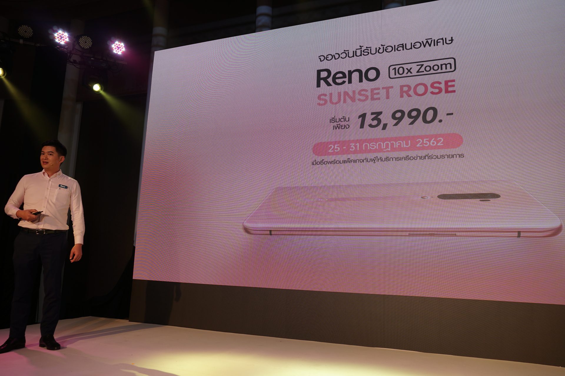 OPPO Reno Series Sunset Rose Limited Edition เปิดตัวทั้ง 2 รุ่น คือ OPPO Reno 10x Zoom ราคา 28,990 บาท และ OPPO Reno ราคา 16,990 บาท สามารถจองได้ตั้งแต่วันนี้ ถึงวันที่ 31 กรกฎาคม ที่ผู้ให้บริการเครือข่ายทั่วประเทศในราคาเริ่มต้นเพียง 13,990 บาท และสามารถจองได้ตั้งแต่วันนี้ ถึงวันที่ 1 สิงหาคม ที่ OPPO Brand Shop ทุกสาขา และร้านค้าที่ร่วมรายการ โดยจะเริ่มวางจำหน่ายพร้อมกันทั่วประเทศในวันที่ 2 สิงหาคมเป็นต้นไป