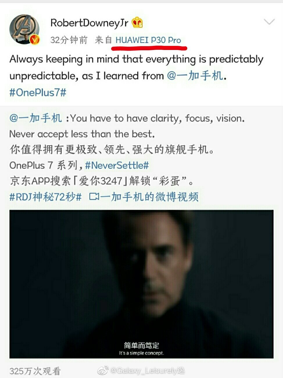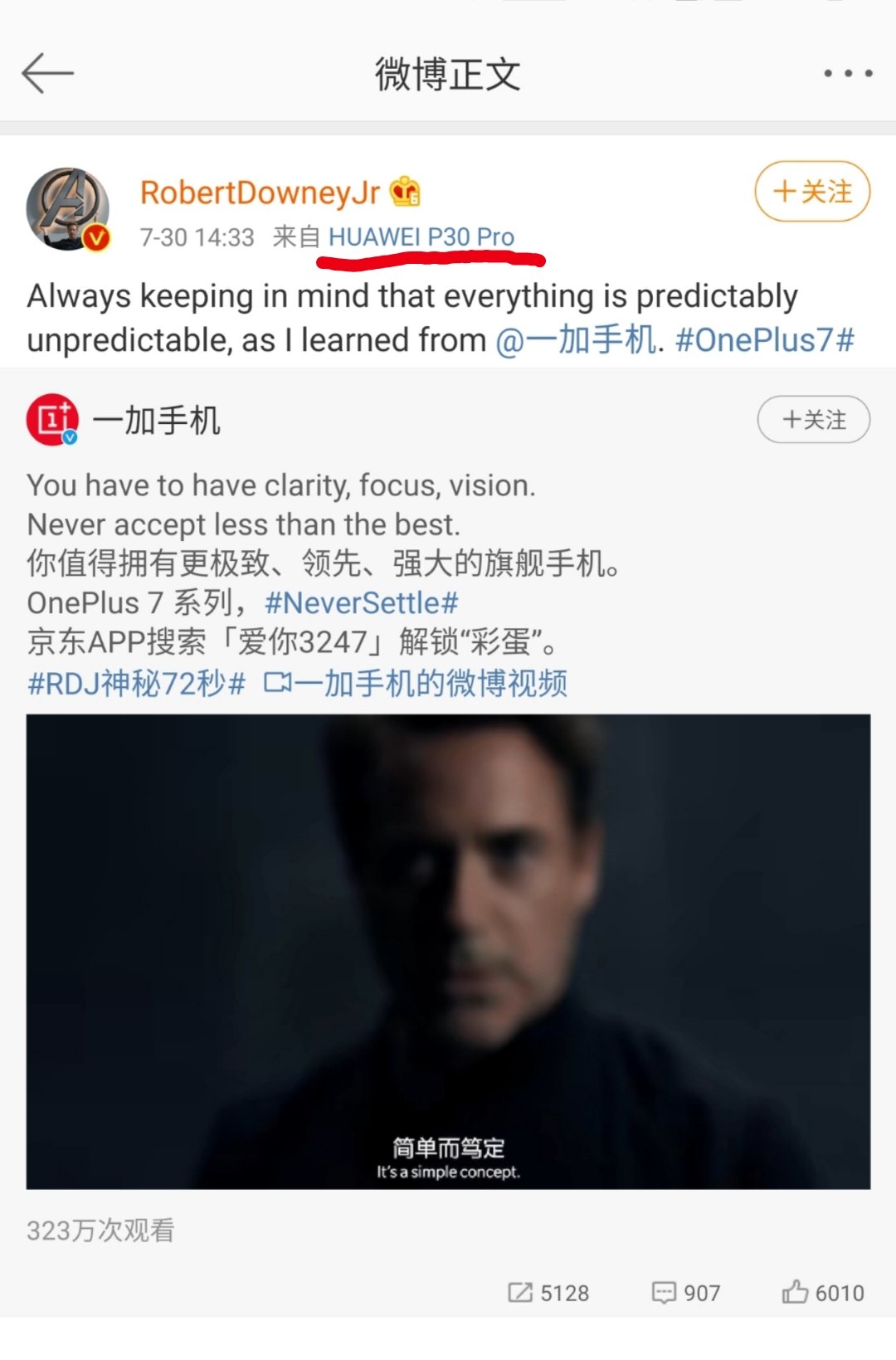 วันที่ 30 กรกฎาคมที่ผ่านมา นักแสดงชื่อดังอย่าง Robert Downey Jr หรือที่รู้จักกันดีในชื่อ Tony Stark (Iron Man) ได้โพสต์ข้อความลงบน Weibo แต่ประเด็นคือ อุปกรณ์ที่ใช้โพสต์ดันไม่ใช่ OnePlus 7 Pro ซึ่งตนเป็น Brand Ambassdor แต่ดันโพสต์จาก Huawei P30 Pro แทนครับ