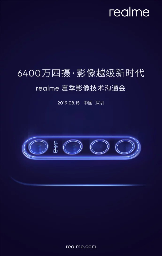 ล่าสุด realme ได้ทวีตภาพโปสเตอร์เตรียมเปิดตัวสมาร์ตโฟนที่มาพร้อมกับกล้องถึง 4 ตัวที่มีความละเอียดสูงถึง 64 ล้านพิกเซล ตัวแรกของโลก โดยใช้เซนเซอร์ขนาดใหญ่ GW1 จาก Samsung ในวันที่ 8 สิงหาคมนี้ ที่กรุงนิวเดลี ประเทศอินเดีย