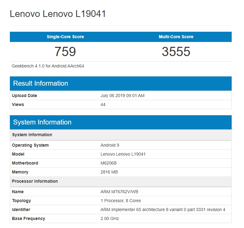 ก่อนหน้านี้สมาร์ตโฟนรุ่นนี้ก็ได้รับการทดสอบบน Geekbench ไปแล้วเช่นกัน ได้คะแนนไปถึง 3,555 คะแนน ซึ่ง A6 Note นี้จะใช้ชิปประมวลผล Helio P22 พร้อมกับ RAM 3GB รันบน Android 9 Pie