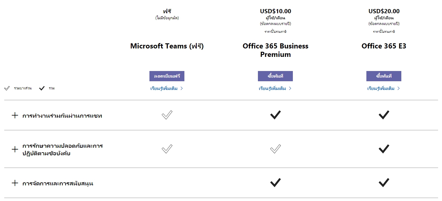 - การประชุม จะสามารถประชุมด้วยกันผ่านทาง Microsoft Teams คล้าย ๆ กับการ Skype ได้พร้อมกันสูงสุดถึง 250 คน และสามารถสร้างการถ่ายทอดสดที่สามารถดูพร้อมกันได้สูงสุดถึง 10,000 คน