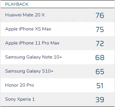 สมาร์ตโฟนรุ่นอื่น ๆ ที่ทำคะแนนรองลงมาคือ Samsung Galaxy Note 10+, Samsung Galaxy S10+, Honor 20 Pro และ Sony Xperia 1 ซึ่งทำได้ 66 คะแนน, 65 คะแนน, 53 คะแนน และ 45 คะแนน ตามลำดับ
