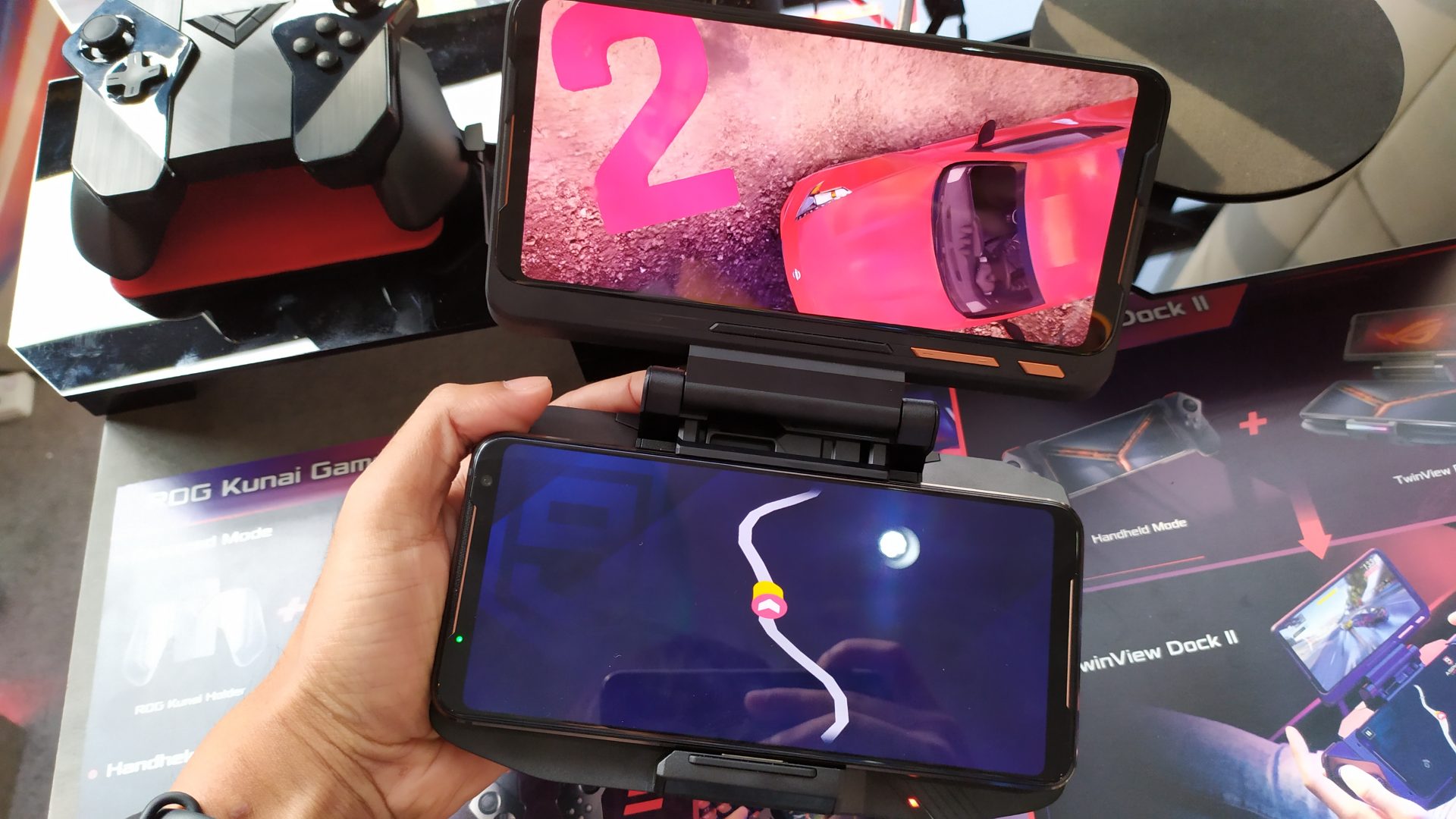 หน้าจอเสริมที่มาในรูปแบบ Docking สามารถพับเก็บลงมาและพกพาไปได้ทุกที่ มาแบตเตอรี่ในตัวถึง 5,000 มิลลิแอมป์ สามารถจ่ายไฟให้ตัว ROG Phone ได้ เสมือนพกพาวเวอร์แบงก์ติดตัวตลอดเวลา นอกจากนี้ หน้าจอรองรับ Refresh Rate มากถึง 120 Hz, รองรับการแสดงผลทั้งสองหน้าจอ ในเกมที่สามารถแสดงผลได้ หรือจะเลือกใช้งานแบบปกติก็ได้ จอหนึ่งเล่นเกม อีกจอไว้เปิด YouTube หรือ Twitch ก็ได้ รวมถึงด้านข้างของ TwinView Dock II ยังรองรับการต่อพ่วง Kunai Gamepad ให้สามารถถือเล่นในสไตล์ Handheld ได้อีกด้วย