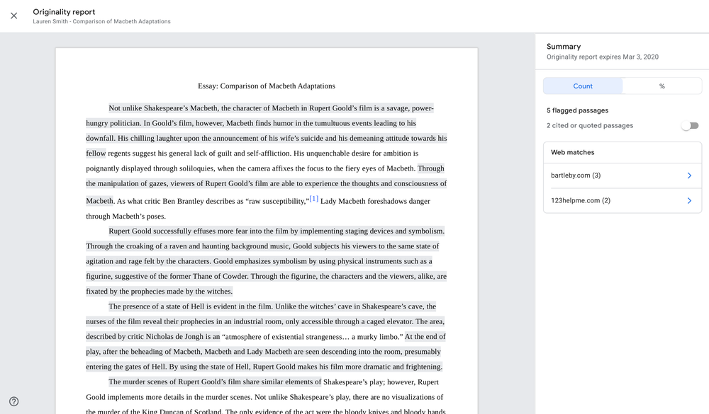 ด้วยฟีเจอร์นี้ ระบบจะตรวจงานหรือการบ้านให้อัตโนมัติว่า มีข้อมูลซ้ำกับงานของใครภายในฐานข้อมูลของโรงเรียนหรือไม่ หรือคัดลอกข้อมูลมาจากเว็บไซต์ใดหรือไม่