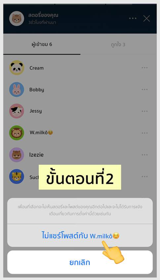 - ไม่ให้เห็นในครั้งต่อไป: กรณีที่รู้สึกว่าไม่อยากให้เพื่อนคนนี้มาเห็นในครั้งต่อไปแล้ว เราก็สามารถทำได้โดยการกดเข้าไปที่ ผู้เข้าชม > กดที่เพื่อน > เลือก ไม่แชร์โพสต์กับเพื่อน