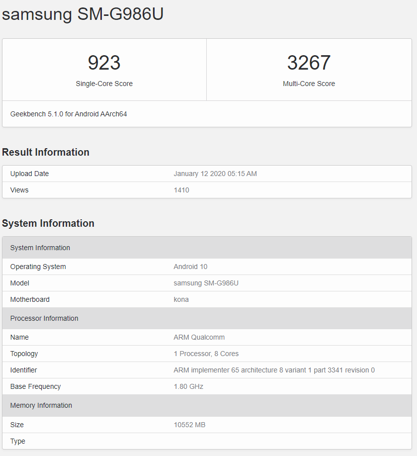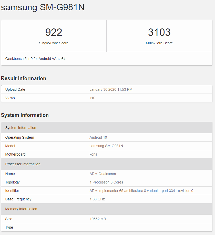 สมาร์ตโฟนเรือธงซีรีส์ Galaxy S20 ของ Samsung ได้แก่ Galaxy S20, Galaxy S20+ และ Galaxy S20 Ultra ได้รับการทดสอบ Benchmark ด้วย Geekbench 5.1 โดยเป็นเวอร์ชันสำหรับจำหน่ายในตลาดประเทศเกาหลีใต้และสหรัฐอเมริกา ซึ่งเผยให้ทราบว่าใช้ขุมพลังจากชิปเซ็ต Qualcomm Snapdragon 865 ด้วยกันทั้งสิ้น