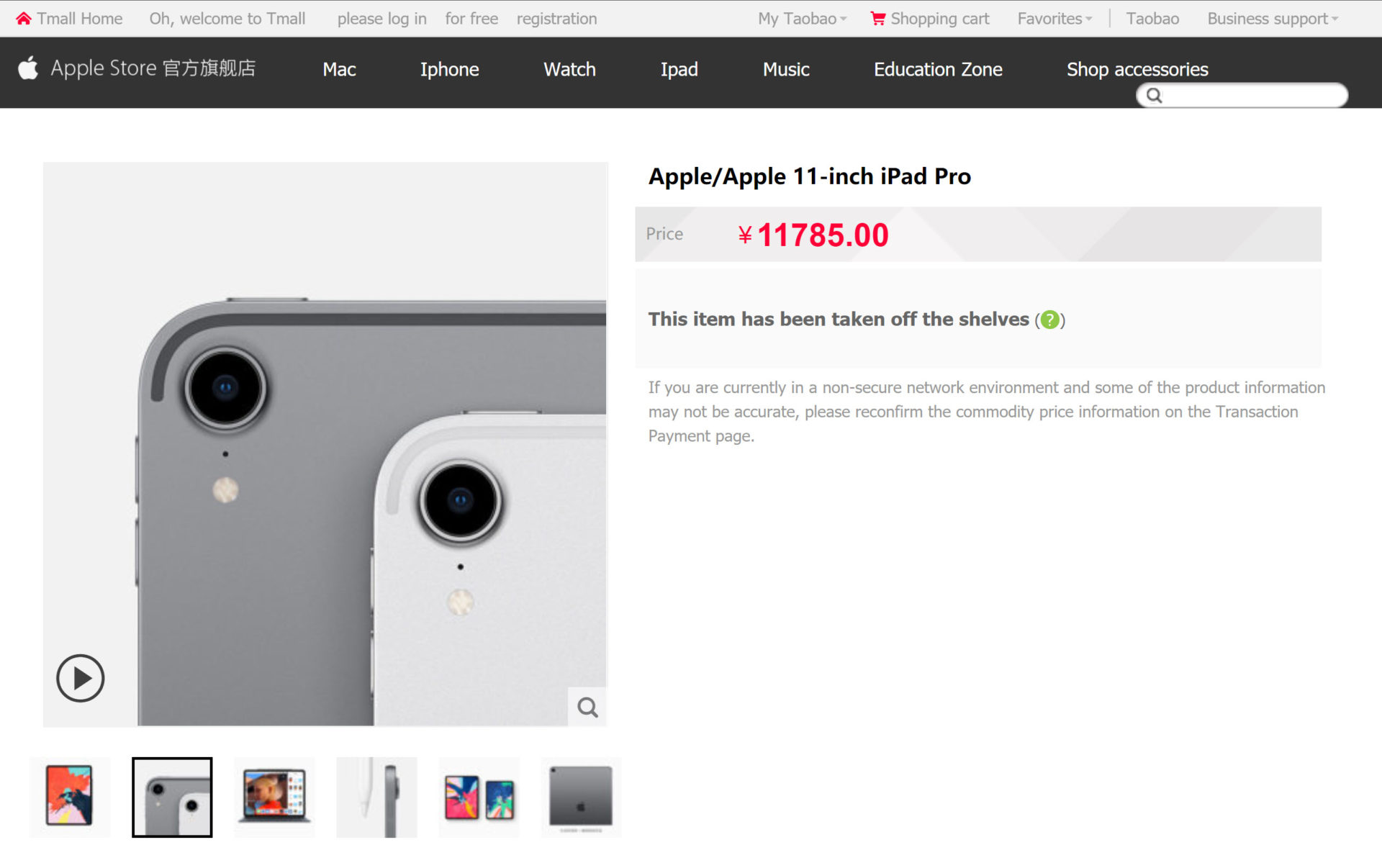 บนหน้าสินค้า iPad Pro ใน Apple Store บน Tmall ของจีน แสดงสถานะของสินค้าว่าถูกลบไปแล้ว