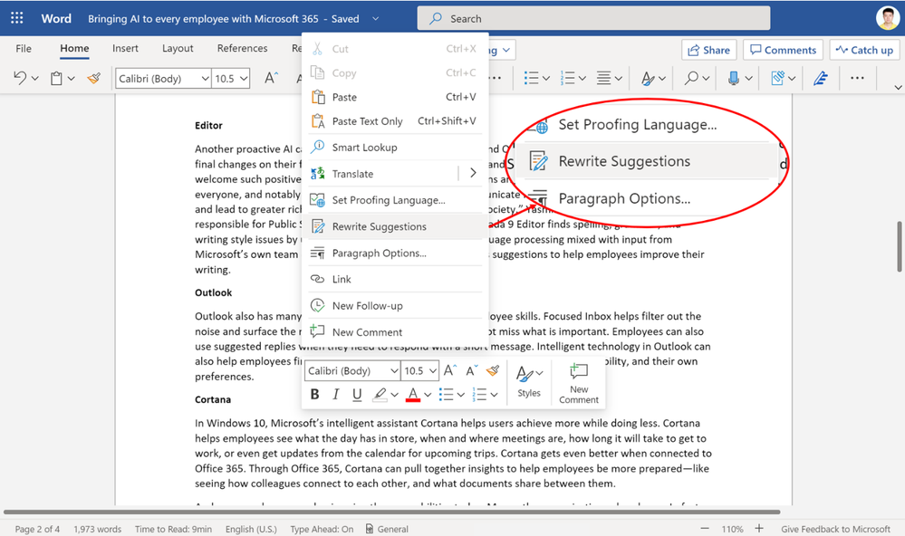 ในงาน Microsoft Build 2019 เมื่อปีที่ผ่านมา มีการเปิดตัวฟีเจอร์ Rewrite Suggestions ที่จะแนะนำการเขียนรายงานหรือบทความ ซึ่งก่อนหน้านี้จะใช้ได้กับ “วลี (Phrase)” เท่านั้น