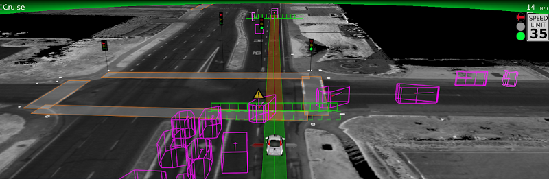 จากภาพคือการคำนวณต่าง ๆ ของรถยนต์ขับเคลื่อนอัตโนมัตินี้ ซึ่งสีม่วงคือรถที่อยู่รอบ ๆ ตัว ส่วนสีฟ้าคือผู้ขับขี่จักรยานที่กำลังมีเส้นทางตัดผ่านเส้นทางตัวรถที่ไป โดยจะมีการคำนวณเส้นทางคร่าว ๆ ของจักรยานคันนั้นเพื่อป้องกันไม่ให้เกิดการขับออกไปชนนั่นเอง