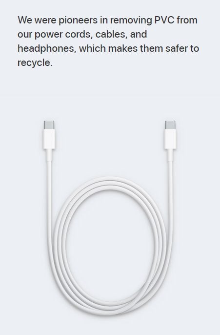 ซึ่งข้อมูลจากหน้า Toxins ระบุว่าสายต่างๆ ของแอปเปิ้ลนั้นไม่ได้ใช้ PVC หรือ Polyvinyl Chloride พลาสติกที่คงทน มีราคาถูก ใช้กันแพร่หลาย แต่มีผลเสียต่อสิ่งแวดล้อมมาตั้งแต่ปี 1995 โดยแอปเปิ้ลหันไปใช้ Thermoplastic elastomers หรือยางเทอร์โมพลาสติกที่ไม่มีส่วนผสมที่เป็นอันตรายของโบรมีนและคลอรีน ที่เป็นพิษต่อสิ่งแวดล้อมน้อยกว่าแทน ซึ่งก็คาดว่าความทนทานเจ้ายางเทอร์โมพลาสติกที่แอปเปิ้ลใช้นี้แหละ คือสาเหตุว่าทำไมสายแอปเปิ้ลพังง่ายเหลือเกิน