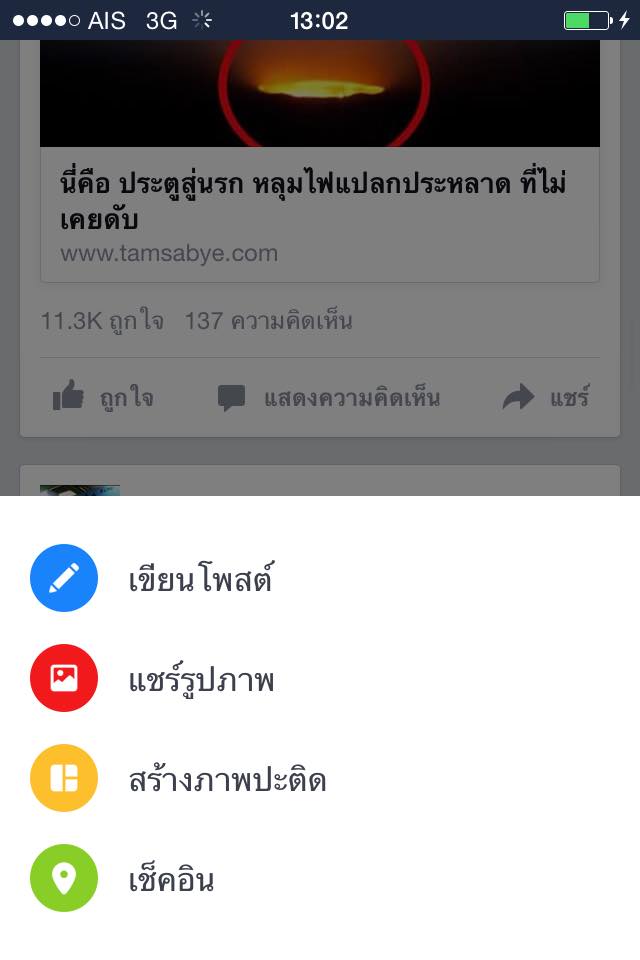 โดยแอปของคุณ Witsarut นั้นจะมีปุ่มเขียนโพสต์ขนาดใหญ่อยู่บริเวณล่างขวา และเมื่อกดเข้าไปก็จะเห็นเมนูย่อยๆ อย่างการแชร์รูปภาพ และเช็คอิน ซึ่ง Witsarut ได้เล่าให้ทีมงานเว็บแบไต๋ฟังว่าลองพยายามลบแอปออกจากเครื่อง แล้วดาวน์โหลดใหม่จาก App Store ก็ยังขึ้นเป็นแบบนี้อยู่ และปุ่มที่ว่านี้จะหายไปเมื่อกดเข้าอ่านเนื้อหา