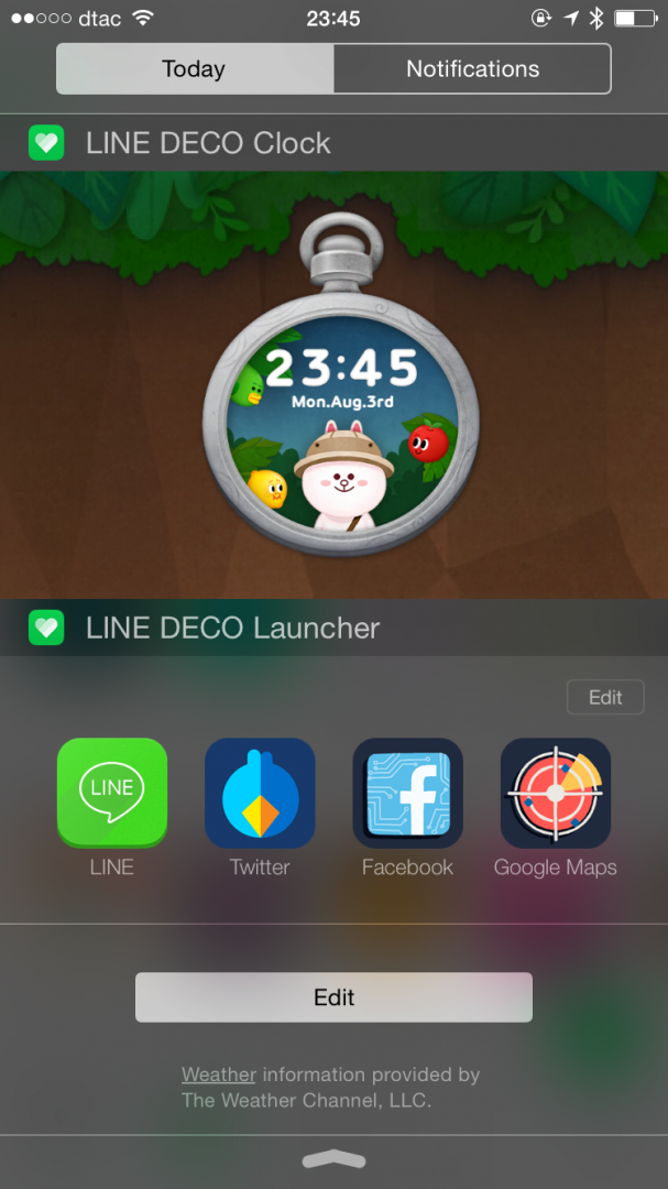 Widget นั้นเป็นความสามารถใหม่ใน iOS 8 นะครับ ทำให้นักพัฒนาสามารถเพิ่มความสามารถเข้าไปใน Notification Center ได้ง่ายๆ ซึ่งที่ผ่านมา LINE Deco ก็มีความสามารถเพิ่มนาฬิกาสวยๆ เพิ่มปฎิทิน หรือเพิ่มแถบแบตเตอรี่เข้าไปในหน้า Today ของ Notification Center อยู่แล้ว แต่ในเวอร์ชั่นล่าสุด ผู้ใช้สามารถเพิ่มตัว Launcher เข้าไปได้ด้วย