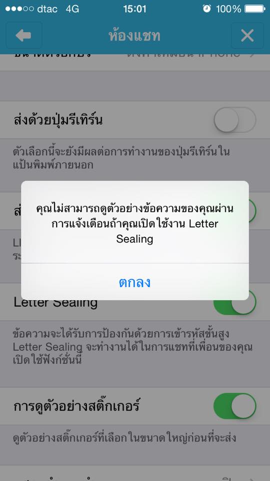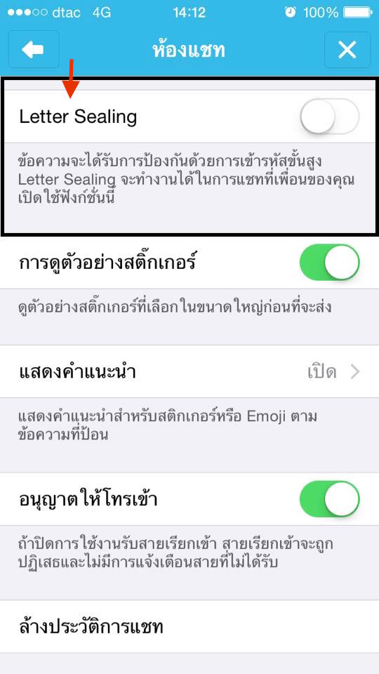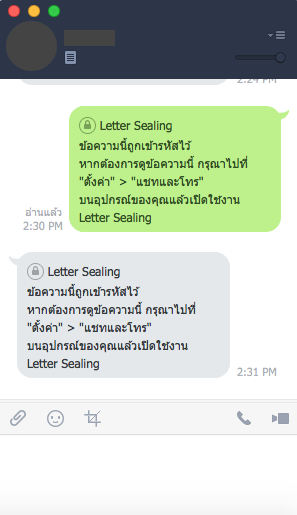 อีกฟีเจอร์นึงที่ไม่พูดถึงไม่ได้เลยก็คือ “Letter Sealing” เจ้าฟีเจอร์นี้คือการป้องกันข้อความ เป็นการป้องกันข้อความด้วยการเข้ารหัสขั้นสูง “Letter Sealing” จะทำงานได้ในการแชทที่เพื่อนของคุณเปิดใช้ฟังก์ชั่นนี้เช่นกัน เมื่อเปิดใช้ “Letter Sealing” แล้ว คุณจะไม่สามารถดูตัวอย่างข้อความของคุณผ่านการแจ้งเตือนได้ แต่ถ้าคุณหยุดการใช้งาน “Letter Sealing” การทำงานไลน์บนอุปกรณ์อื่นๆจะไม่สามารถเห็นข้อความสนทนาได้