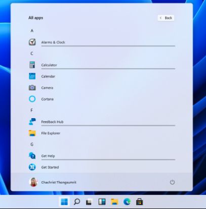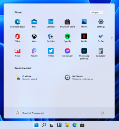 สิ่งแรกที่เปลี่ยนไปอย่างเห็นได้ชัดคือแถบ Task Bar ด้านล่างที่เปลี่ยนเอา Start Menu และ Pinned App มาไว้ตรงกลางจอแทนที่จะเป็นด้านซ้ายสุดของจอ พร้อมกับหน้า Start Menu แบบใหม่ที่จะแสดงผลแค่ตรงส่วนของตรงกลางจอ และไม่ได้ติดอยู่กับปุ่ม Start แล้ว