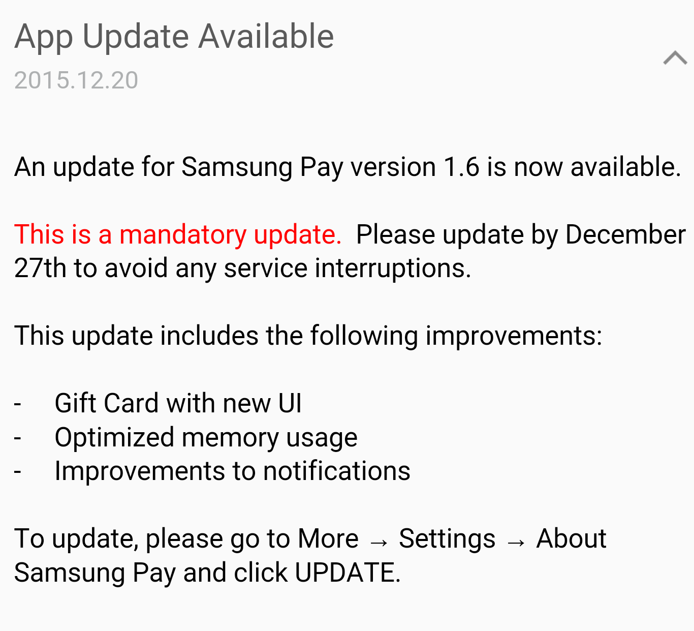 โดยในการอัพเดทครั้งนี้เป็นอัพเดทที่สำคัญ โดยจะต้องอัพเดทภายในวันที่ 27 ธันวาคมนี้ เพื่อหลีกเลื่ยงปัญหาที่จะเกิดขึ้นกับบริการ โดยตัวอัพเดทก็จะปรับปรุง UI สำหรับ Gift Card, ปรับปรุงเรื่องการแจ้งเตือน และอื่นๆ