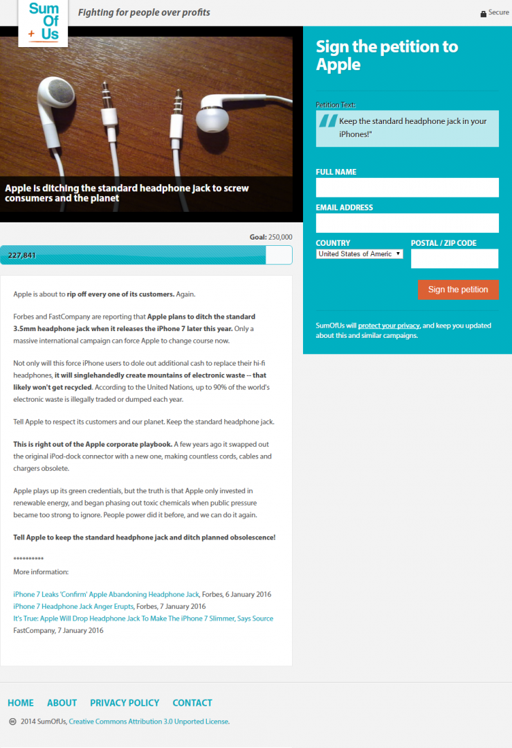 หลายๆคนคงได้ยินข่าวลือว่าใน iPhone 7 ที่จะออกใหม่นั้นจะไม่มีแจ็คสำหรับเสียบหูฟังขนาด 3.5 มม. และจะเปลี่ยนไปใช้แบบ Lightning เพื่อความบางของตัวเครื่อง และยังมีหลายแหล่งข่าวยืนยันว่าเป็นจริง แต่ผู้ใช้บางกลุ่มกลับไม่อยากที่จะให้ Apple เปลี่ยนจากแจ็คเสียบหูฟังไปใช้พอร์ต Lightning แทน โดยลงชื่อกันผ่านเว็บไซต์ Sum of Us (ในทั้งๆที่ตัวเครื่องยังไม่มีการผลิตออกมา และยังไม่ได้รับการยืนยันจาก Apple)