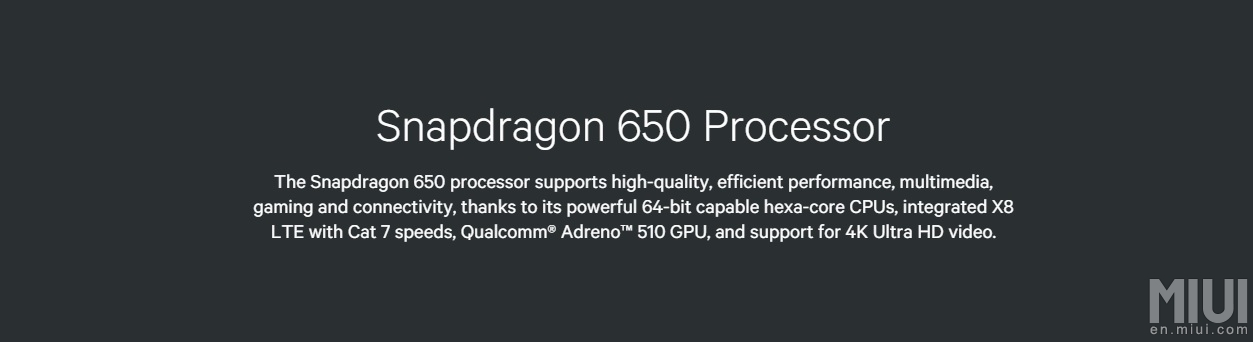 ตัวนี้จะใช้งานชิป Qualcomm Snapdragon 650 ภายใน ซึ่งต่างจาก Redmi Note 3 รุ่นก่อนหน้าที่ใช้ Mediatek MT6795