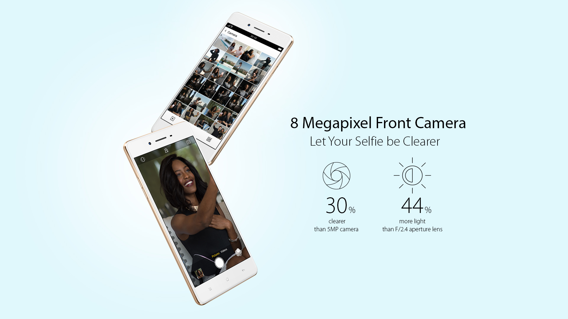 ในเรื่องของกล้องนั้น Oppo F1 จะมีกล้องหน้าความละเอียด 8 ล้านพิกเซล f/2.0 มาพร้อมกับแฟลชด้านหน้า เพื่อเซลฟี่โดยเฉพาะ ส่วนกล้องหลังนั้นจะมีความละเอียด 13 ล้านพิกเซล f/2.2