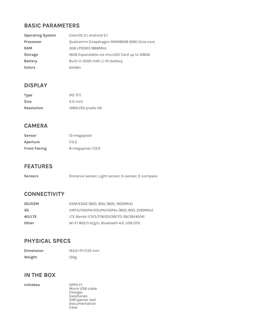 Oppo F1 นั้นมาในรูปแบบตัวบอดี้โลหะสีทอง มีความบางเพียง 7.25 มม. น้ำหนัก 134 กรัม มาพร้อมกับจอขนาด 5 นิ้วความละเอียด HD 1280×720 พิกเซล ใช้ชิปประมวลผล Snapdragon 616 SoC 1.7 GHz